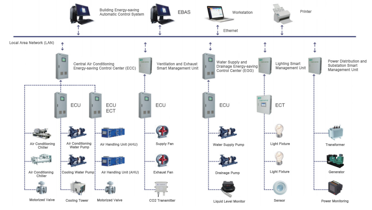 The smart park system solution includes subsystems such as the high-efficiency cold/heat room smart management system, air-conditioning terminal energy-saving control system, fan coil temperature control management system, air supply and exhaust control system, smart lighting control system, domestic hot water control system, and water supply and drainage supervision system. This enables energy-saving optimization upgrades for HVAC, steam/hot water, water supply and drainage, air supply and exhaust, smart lighting, smart power distribution, and new energy systems, reducing operational costs and improving management efficiency and quality. Achieving the management goals of "clean energy supply, digital energy consumption, efficient energy utilization, smart energy configuration, and diversified energy services".