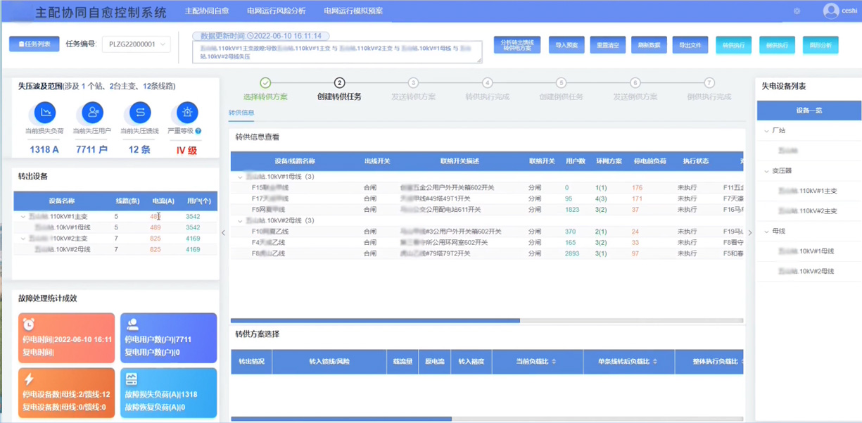 主配协同故障诊断与自愈控制系统实现在主网发生故障时,通过主配全要素协同控制解决馈线负荷大面积、长时间停电问题。通过系统全面地分析配网运行数据,对于主网故障开展配网馈线负荷转移,提供多选择馈线转供方案,并自动选择最优转供方案,提升主网故障转供能力,减小主网运行风险。